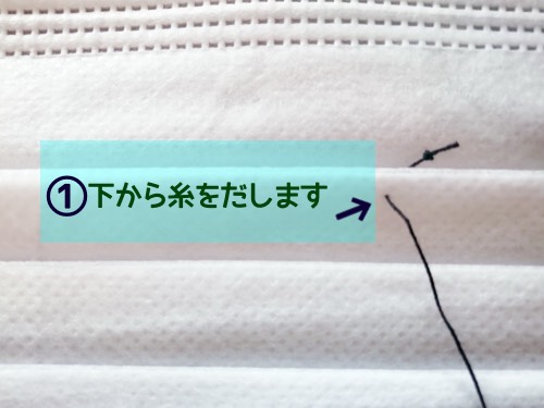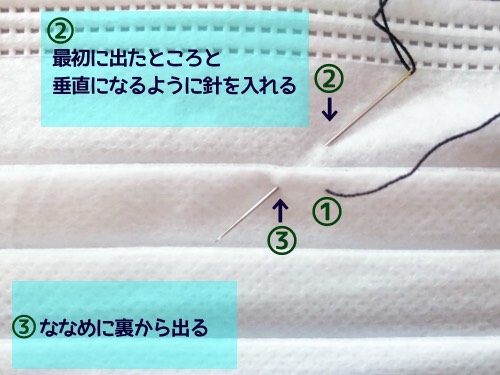 裏側から針を斜めに移動させて③の位置から針を出します。