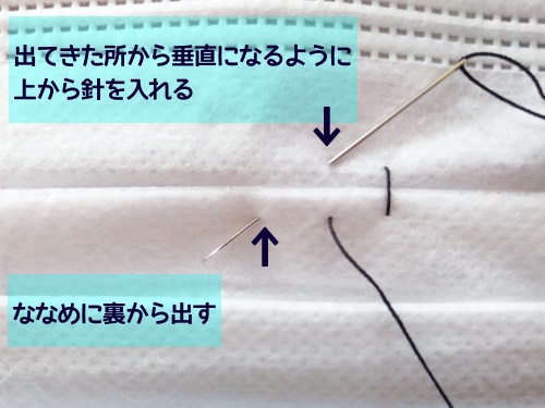 糸を出した所から垂直になる様に再び針を入れます。