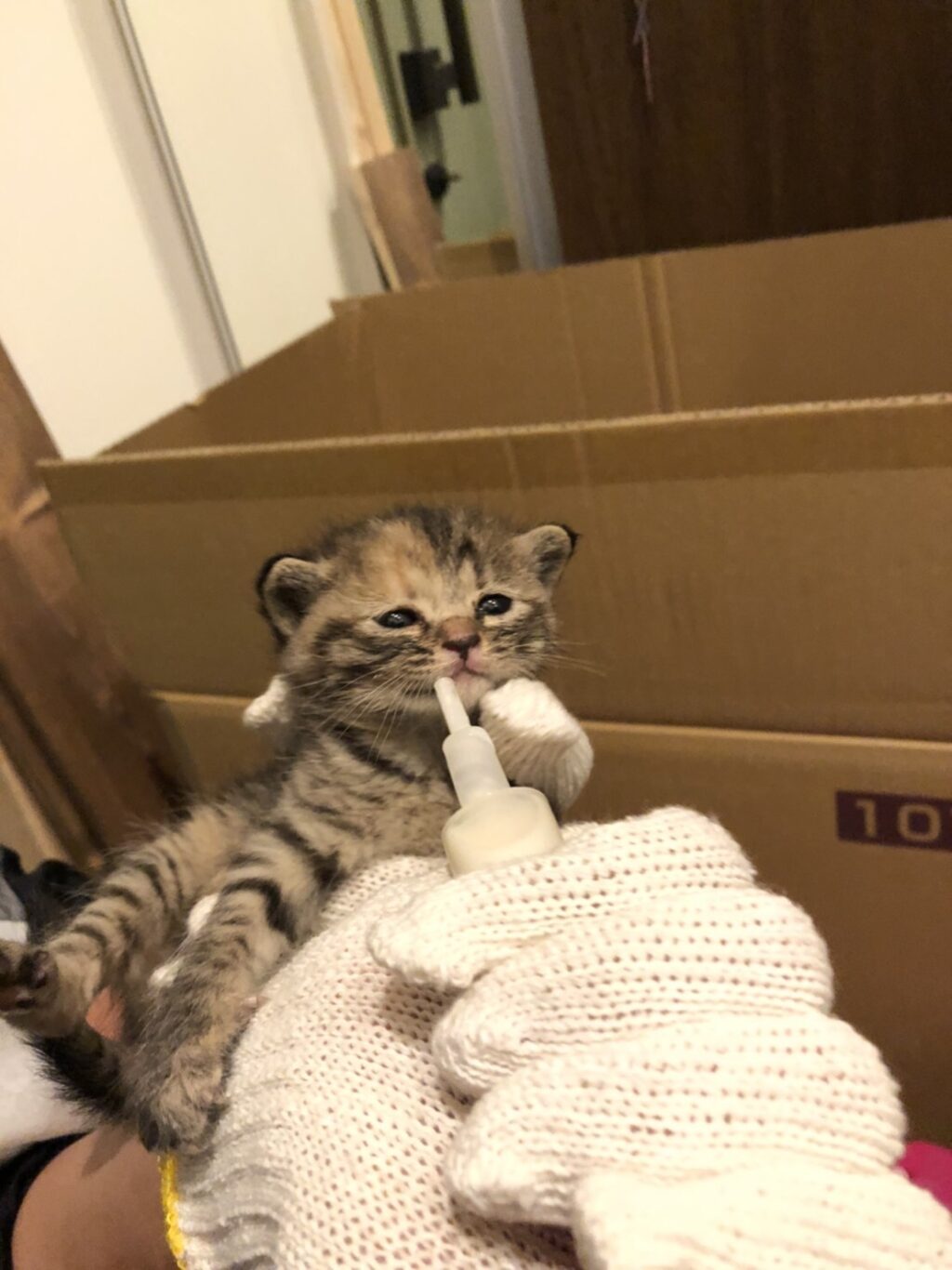 保護した子猫はおよそ生後3週間で、4時間置きに授乳することにしました。